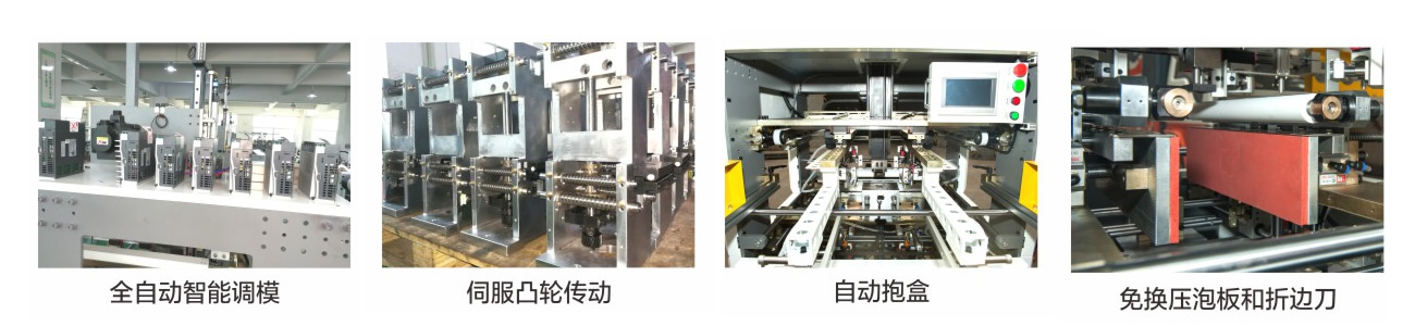 3.免換壓泡板和折邊刀:該機已經裝好固定長度的壓泡板和折邊刀,適應任意尺寸紙盒的生產,無需更換拆卸,節(jié)省了轉板時間和成本。